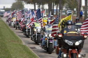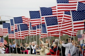 Hundreds of American flags colored Monday's gray skyline in honor of the return of a Montgomery County hero.